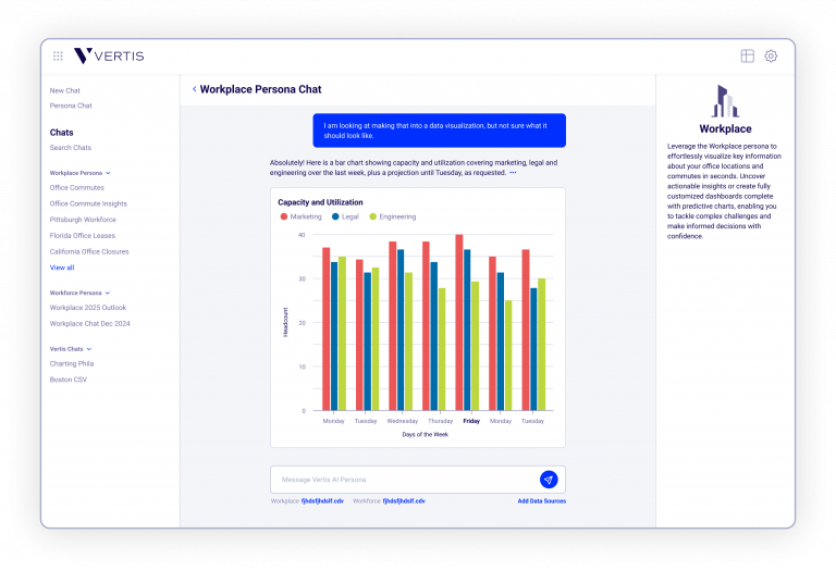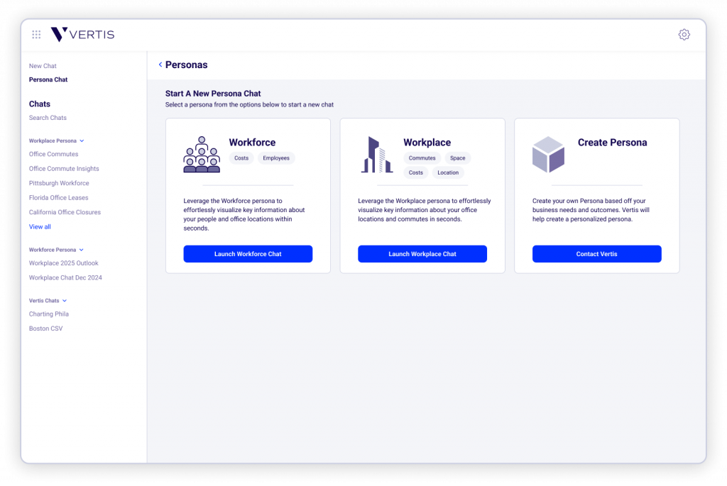 Most AI chat experiences are general-purpose. Vertis 2.0 uses personas as domain-guided expert modes for Workforce and Workplace. This reduces prompt burden, improves consistency, and creates a surface area we can tune over time.