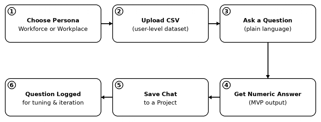 The primary workflow is: persona selection → CSV ingestion → natural-language query → numeric response → project-based persistence → session-level logging for ongoing improvement.